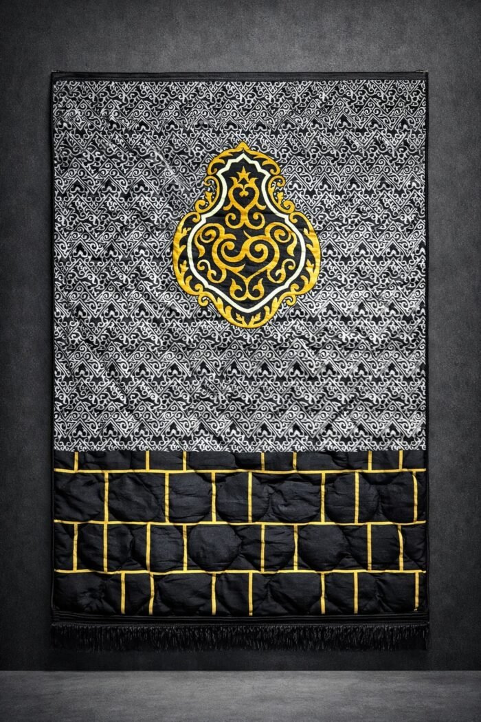 The elegant black and gold pattern adds a touch of luxury and spirituality to your prayer space. Its thick cushioned base ensures support on hard floors, while the premium fabric offers durability and long-lasting use.